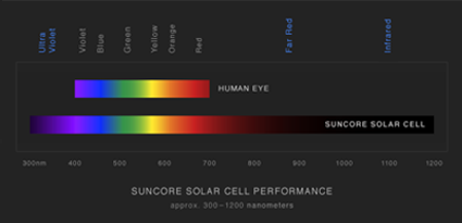 Well past the range of color our eyes can see, is a vast amount of useable solar energy. SunCore's light-charging cell design derives energy from both visible and non-visible parts of the spectrum more efficiently, increasing performance and generating power even without direct sunlight.
